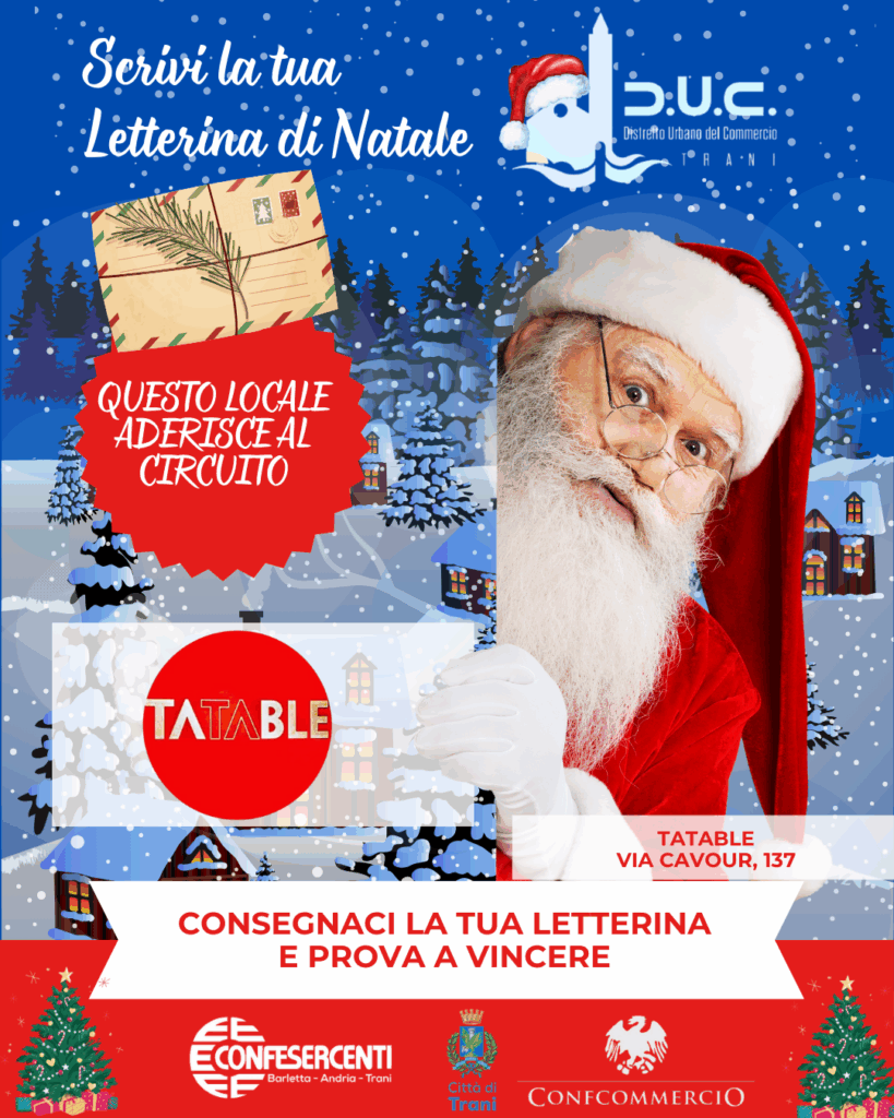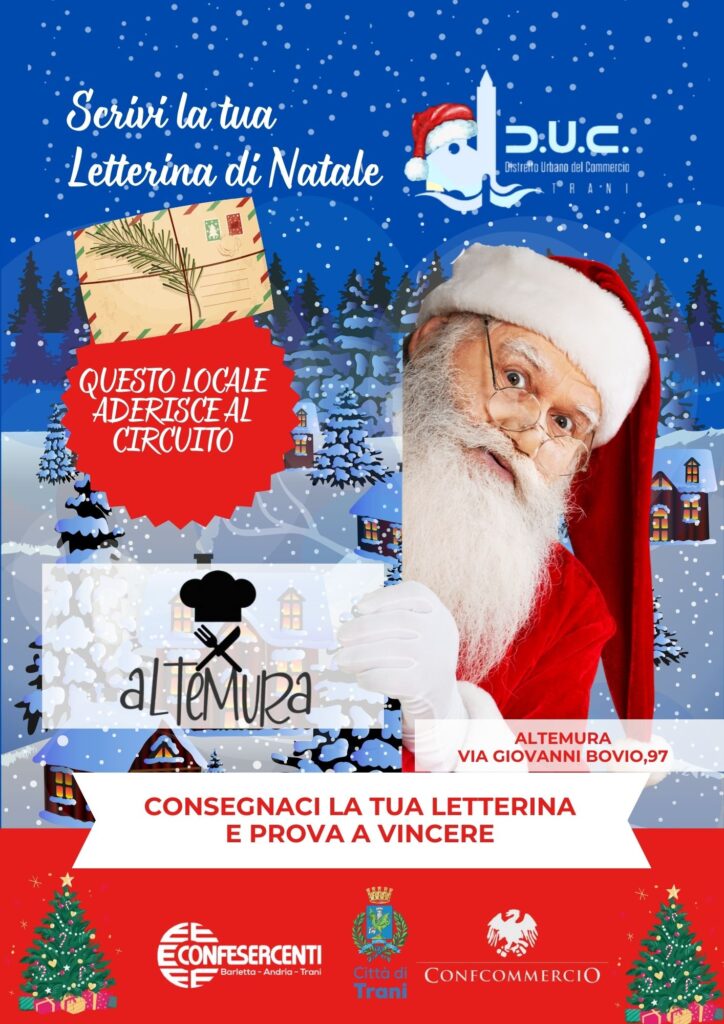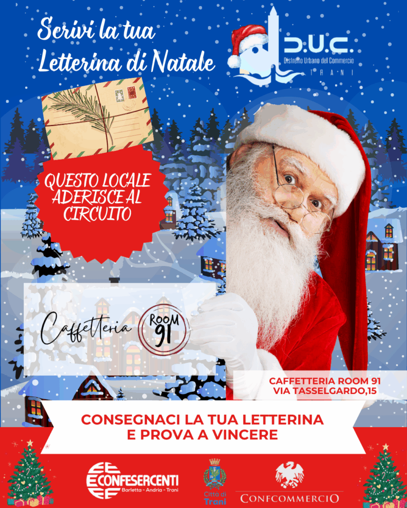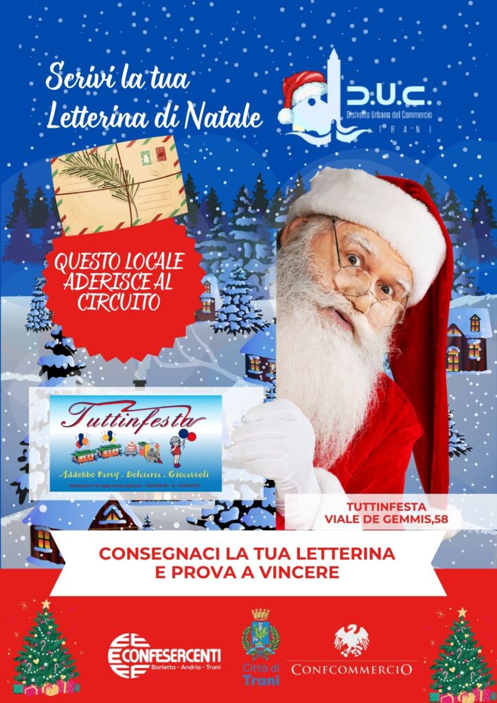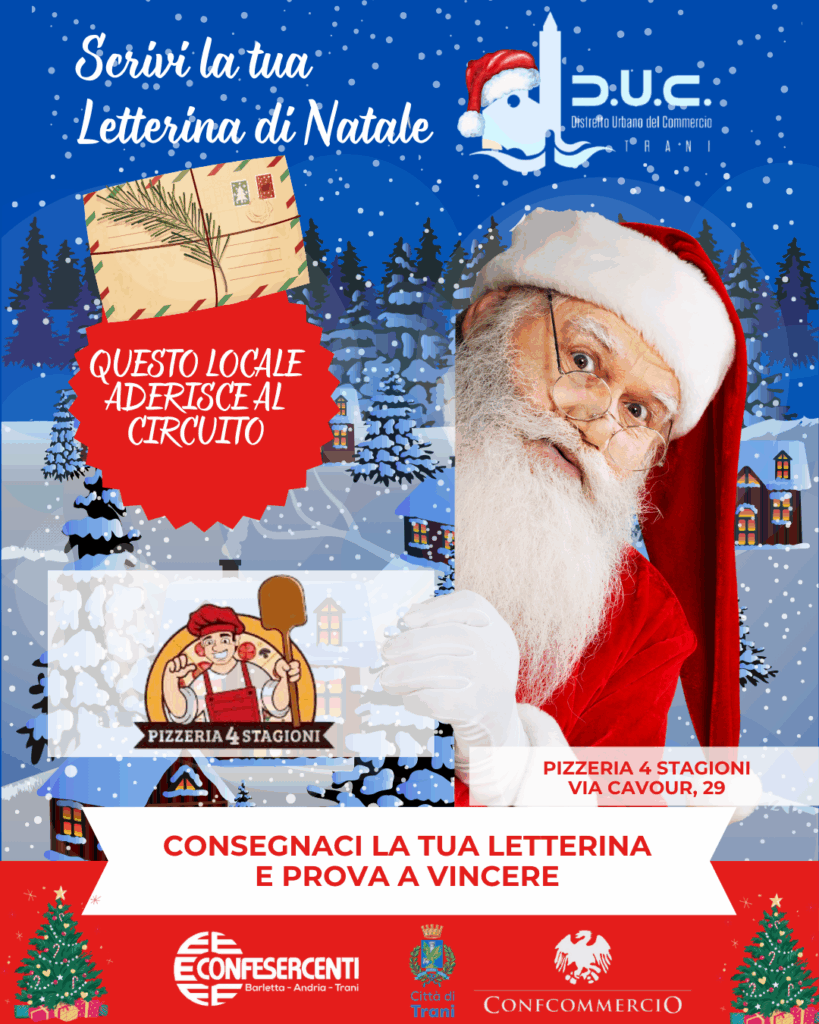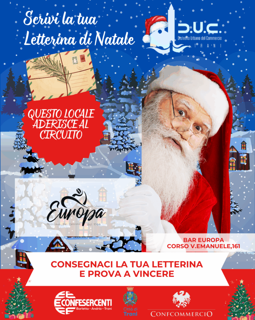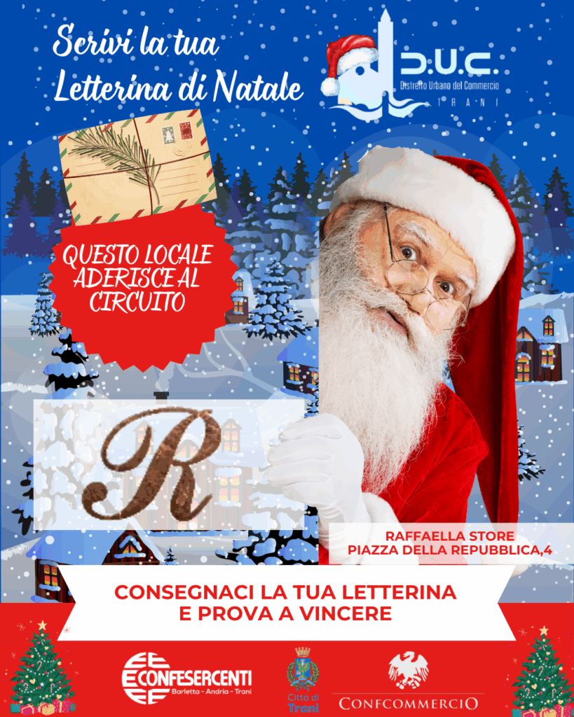 Il Distretto Urbano del Commercio di Trani, insieme agli esercizi di vicinato aderenti, invita tutti i bambini a vivere la magia del Natale con un gesto semplice e speciale: scrivere la propria letterina di Natale e consegnarla nei negozi che espongono la locandina dell’iniziativa.