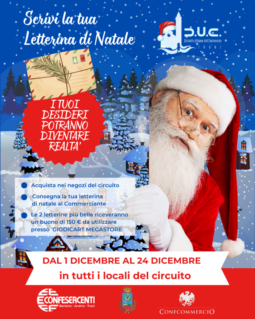 L’iniziativa, è stata ideata con l’intento di valorizzare la spontaneità, la creatività e la sensibilità dei bambini, invitandoli a esprimere, attraverso la classica Letterina da inviare a Babbo Natale, la loro personale visione del Natale, coinvolgendo contestualmente i loro genitori ed una rete di esercenti della Città di Trani, in particolare quelli aderenti al Distretto ed iscritti all’Albo Regionale delle Aziende Storiche.