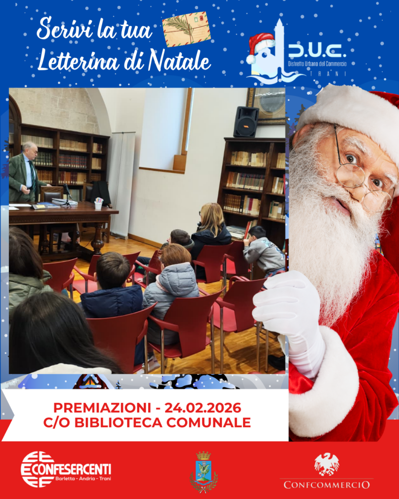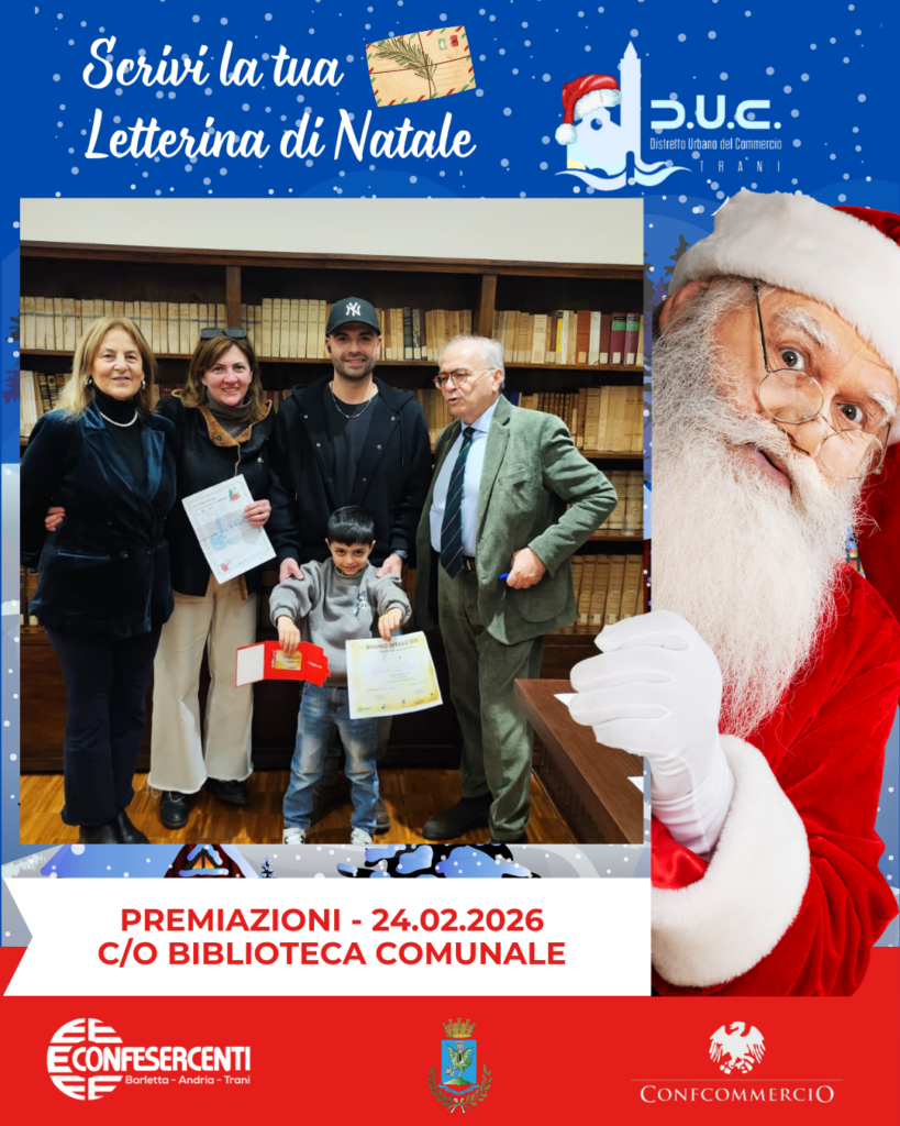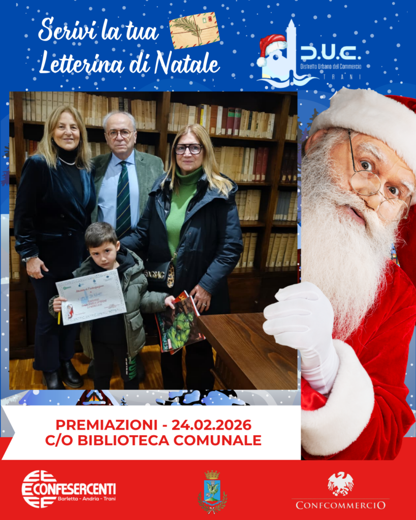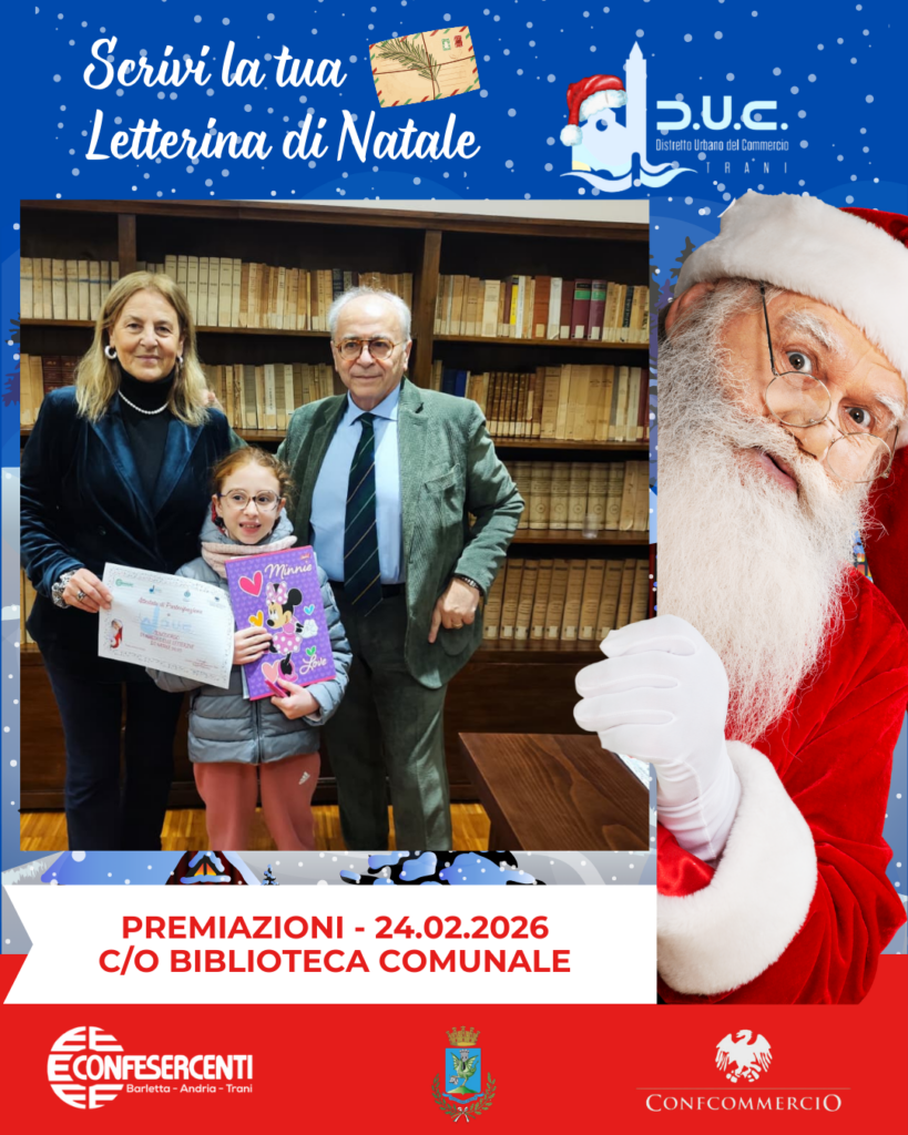Trani, 24 febbraio 2026 – Si è svolta, Martedì 24, alle ore 17.00, presso la Biblioteca Comunale di Trani, la cerimonia di premiazione del concorso, riservato a Bambini di età massima 10 anni , “La magia delle letterine di Natale 2025”, promosso e organizzato dal Distretto Urbano del Commercio (DUC), Confesercenti e Confcommercio, patrocinato dal Comune di Trani.