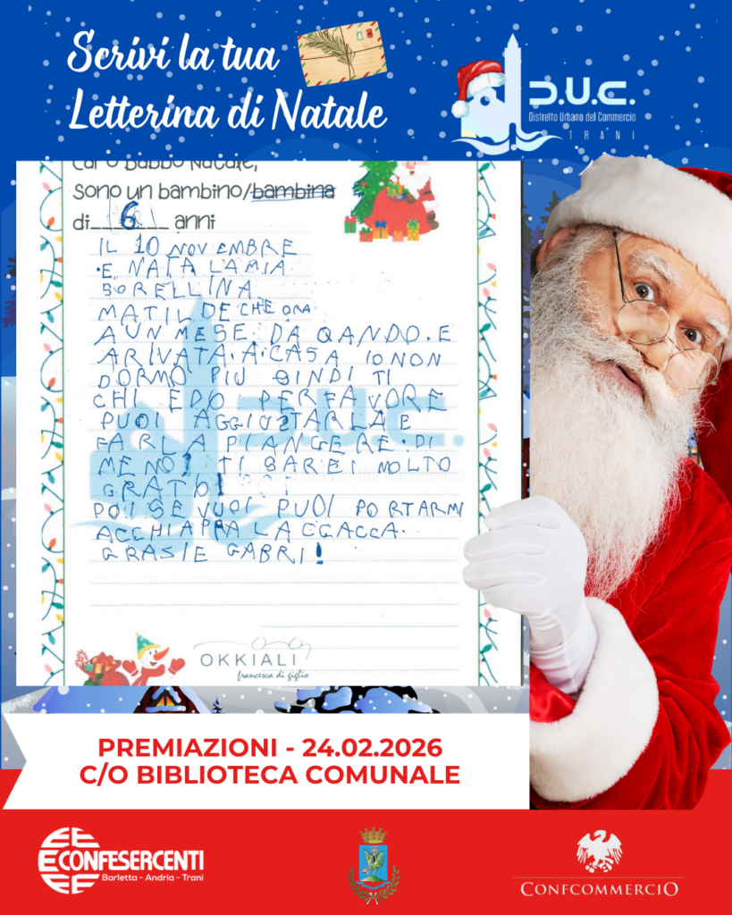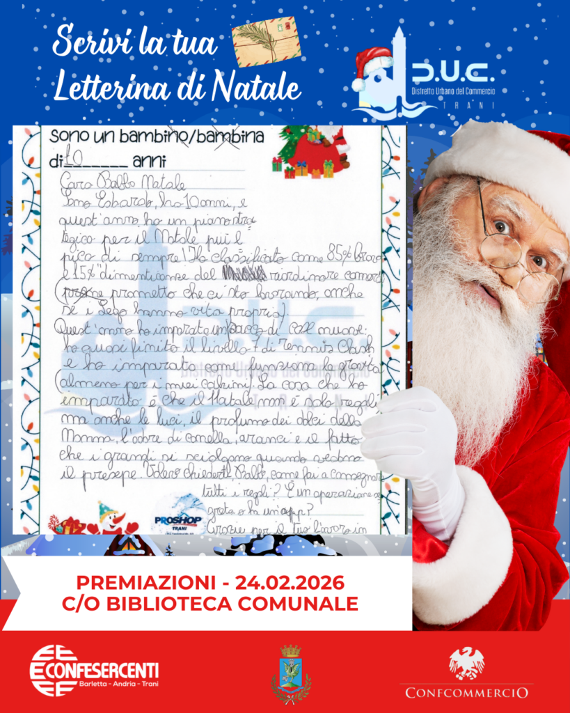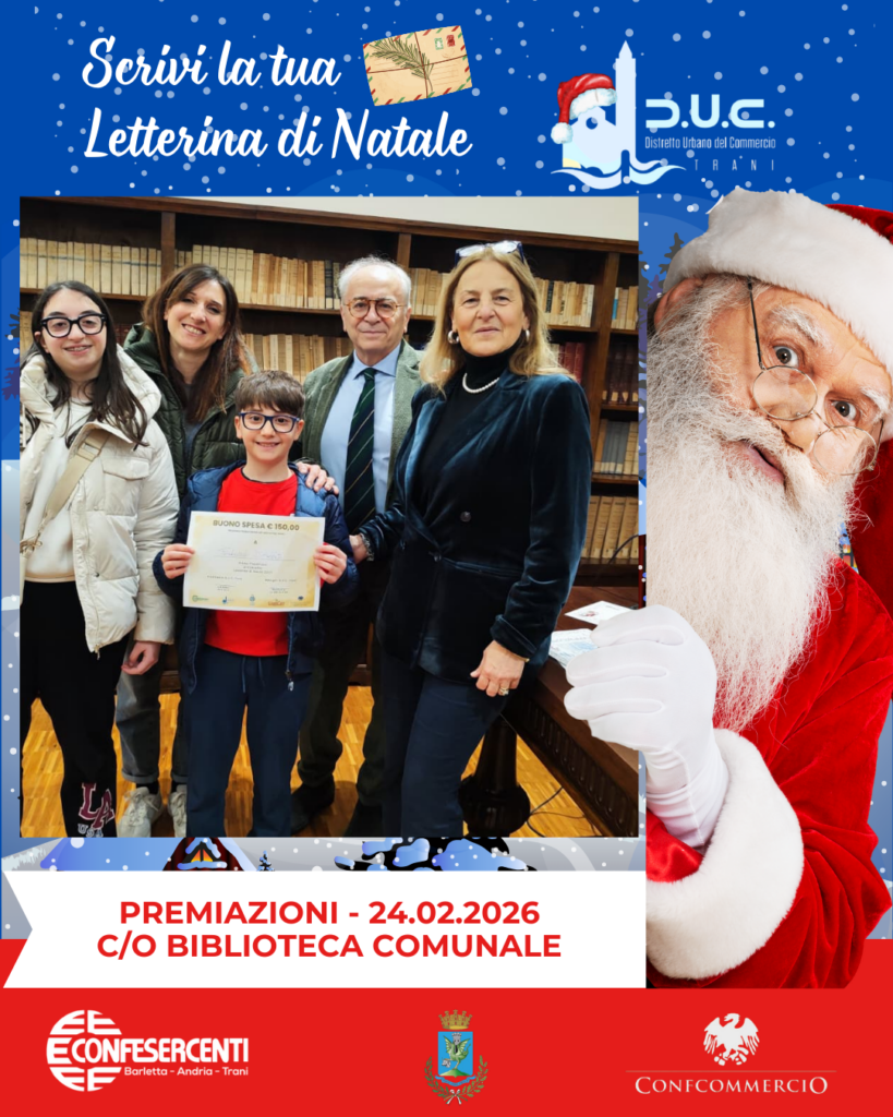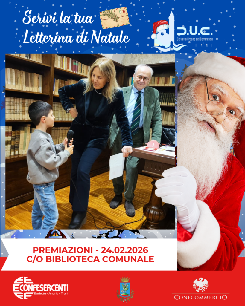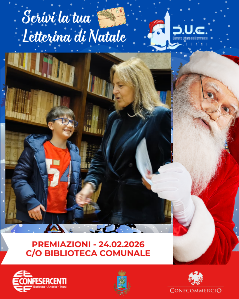 Trani, 24 febbraio 2026 – Si è svolta, Martedì 24, alle ore 17.00, presso la Biblioteca Comunale di Trani, la cerimonia di premiazione del concorso, riservato a Bambini di età massima 10 anni , “La magia delle letterine di Natale 2025”, promosso e organizzato dal Distretto Urbano del Commercio (DUC), Confesercenti e Confcommercio, patrocinato dal Comune di Trani.