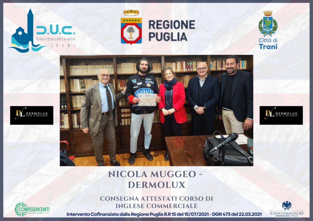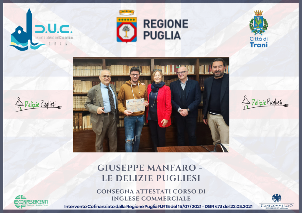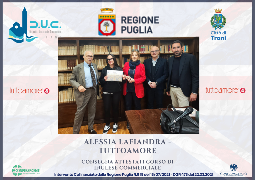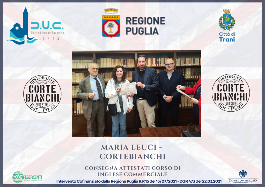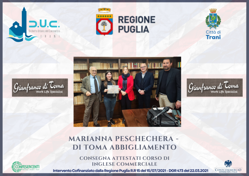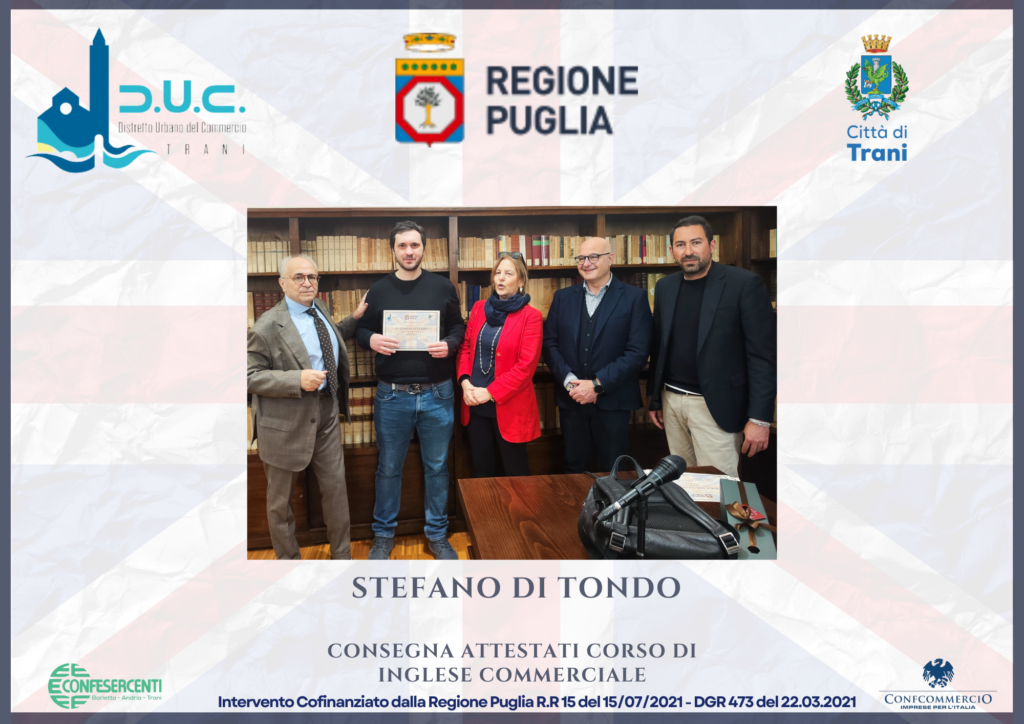 Con la consegna degli attestati del corso di inglese gratuito e quello di Armocromia, alla presenza dell’ Assessore alle Attività Produttive, arch. Capone e dell’ Assessora alla Cultura, dott.ssa De Mari,il Manager del DUC di Trani, unitamente agli assessori, hanno avuto modo di rivolgere un sincero ringraziamento ed apprezzamento per aver raccolto l’invito delle Associazioni di categoria Confcommercio e Confesercenti, nonché del Sindaco, Presidente del DUC, avv. Bottaro, a seguire una particolare attività formativa utile a migliorare l’accoglienza turistica nella Città di Trani.