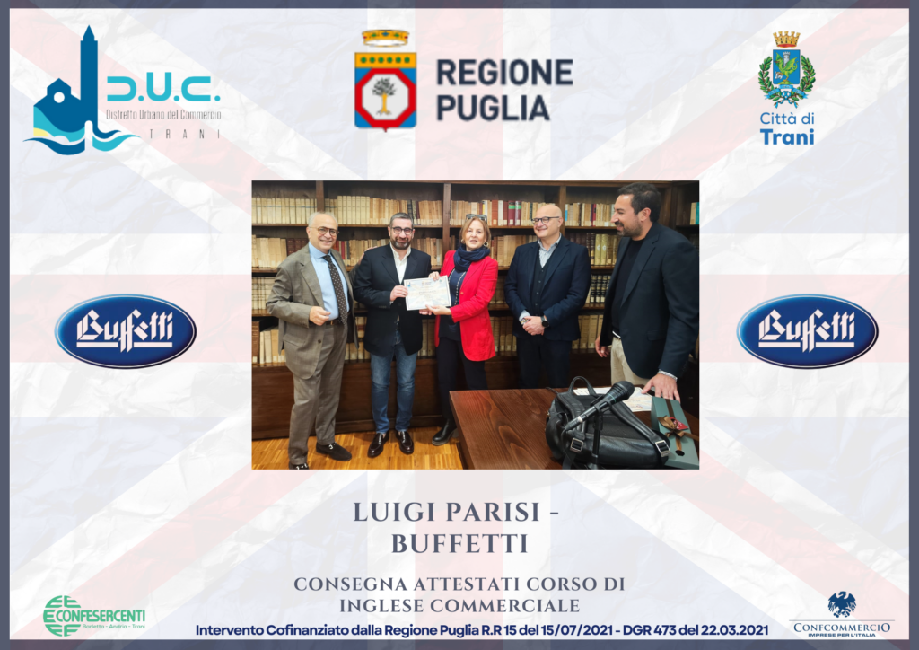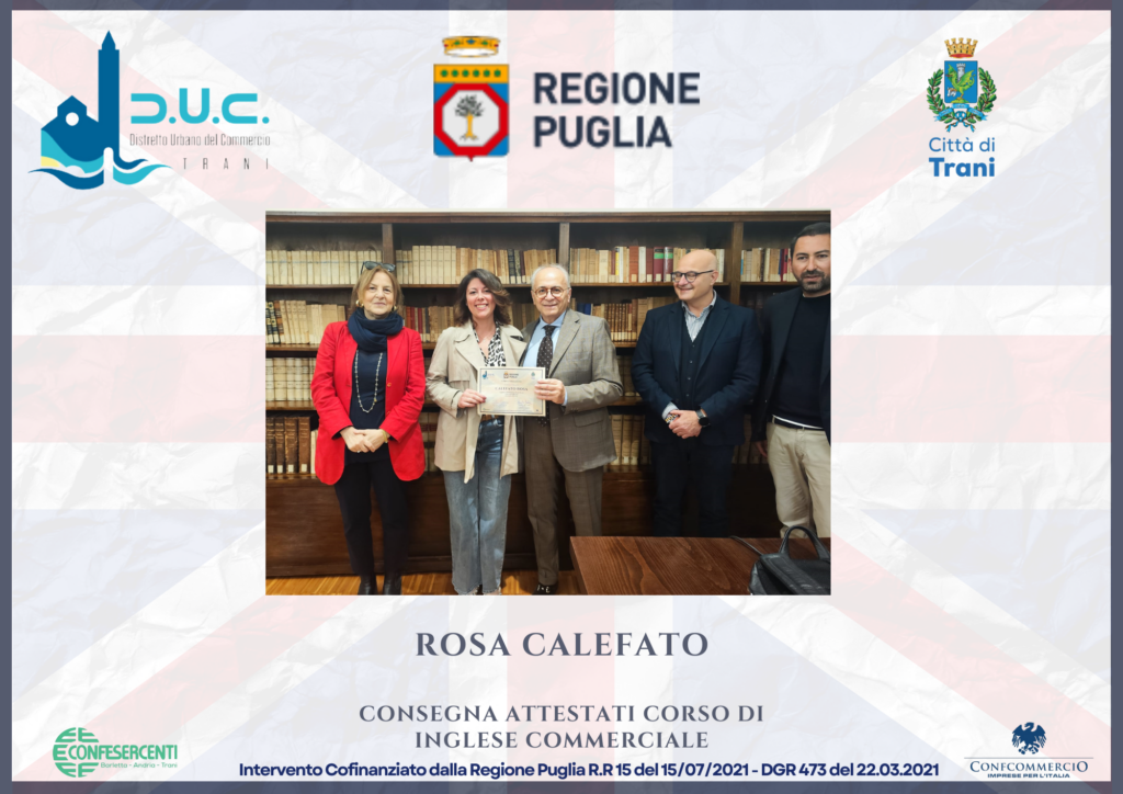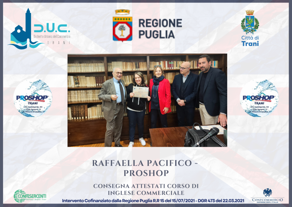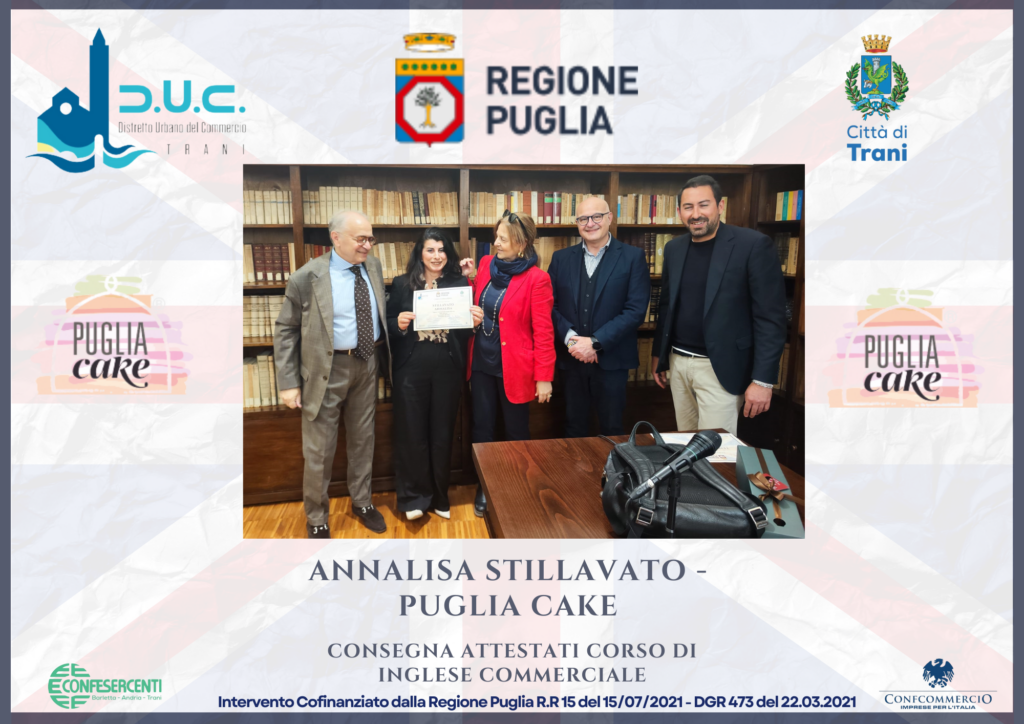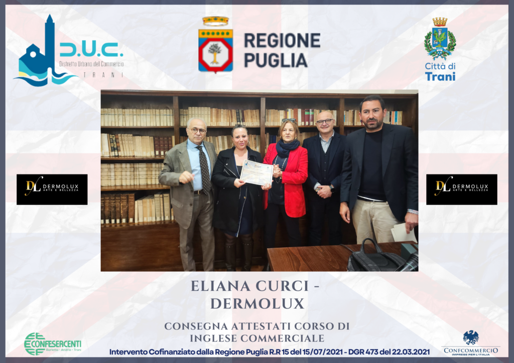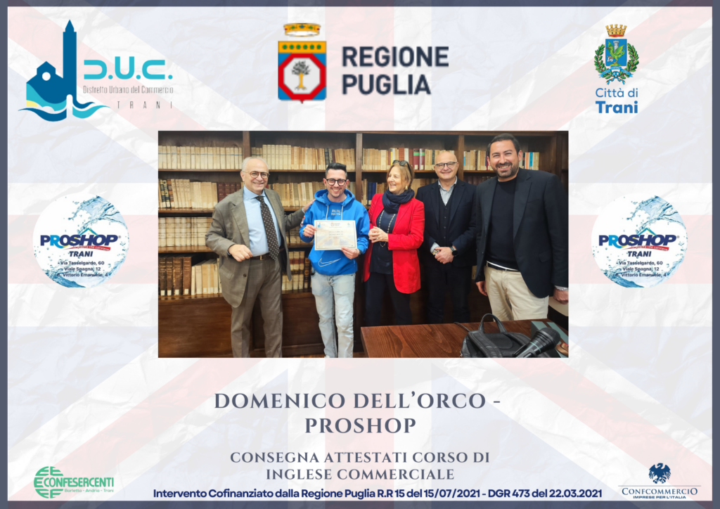 Con la consegna degli attestati del corso di inglese gratuito e quello di Armocromia, alla presenza dell’ Assessore alle Attività Produttive, arch. Capone e dell’ Assessora alla Cultura, dott.ssa De Mari,il Manager del DUC di Trani, unitamente agli assessori, hanno avuto modo di rivolgere un sincero ringraziamento ed apprezzamento per aver raccolto l’invito delle Associazioni di categoria Confcommercio e Confesercenti, nonché del Sindaco, Presidente del DUC, avv. Bottaro, a seguire una particolare attività formativa utile a migliorare l’accoglienza turistica nella Città di Trani.
