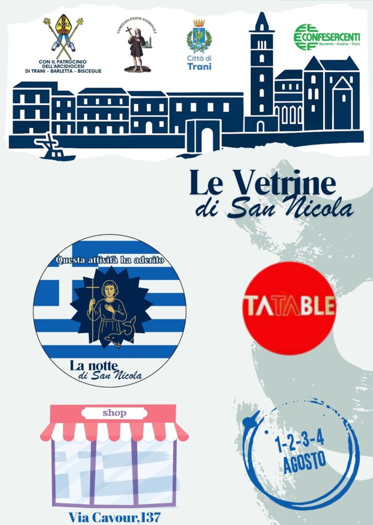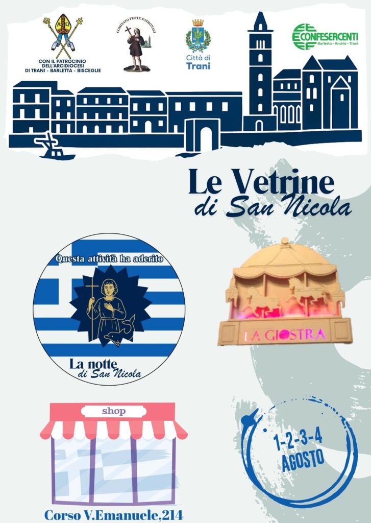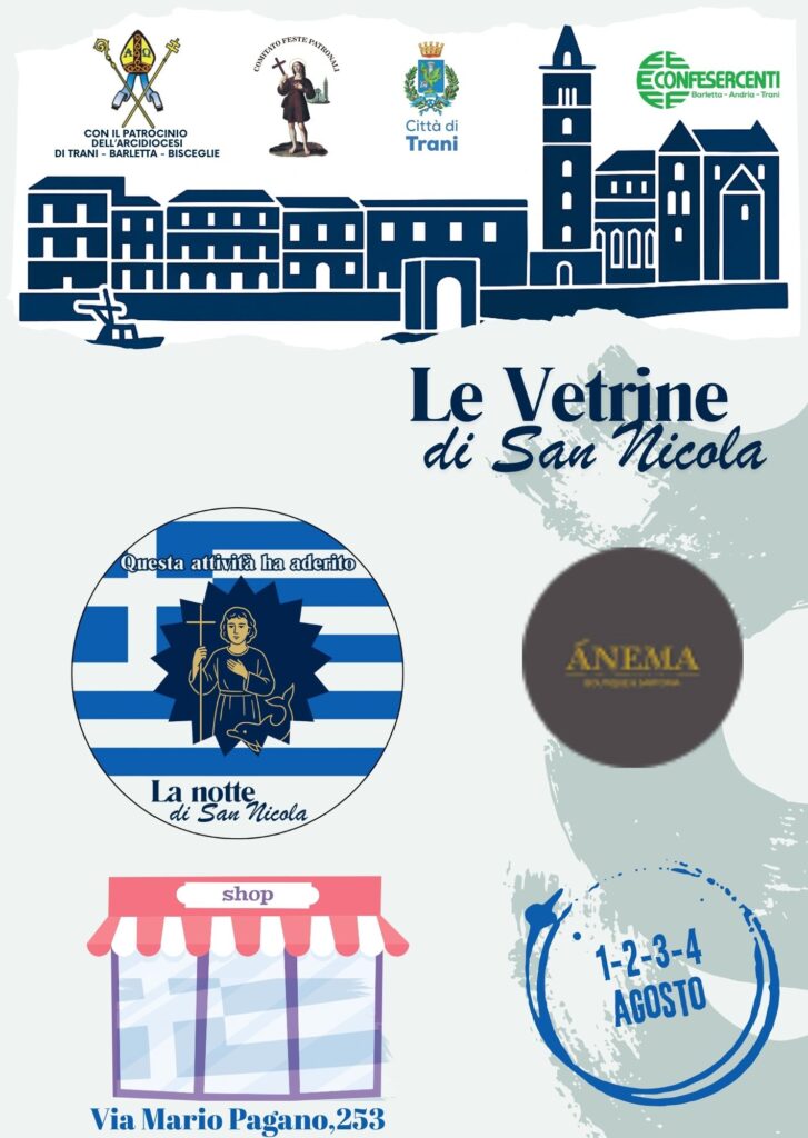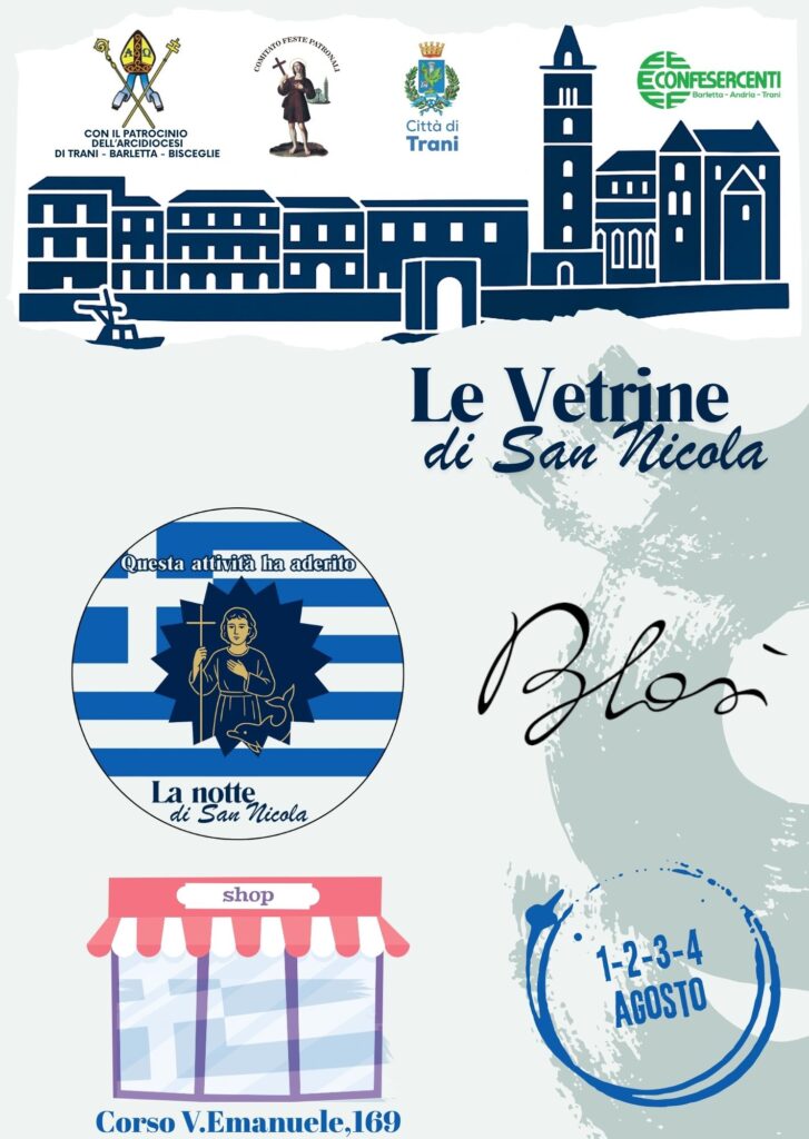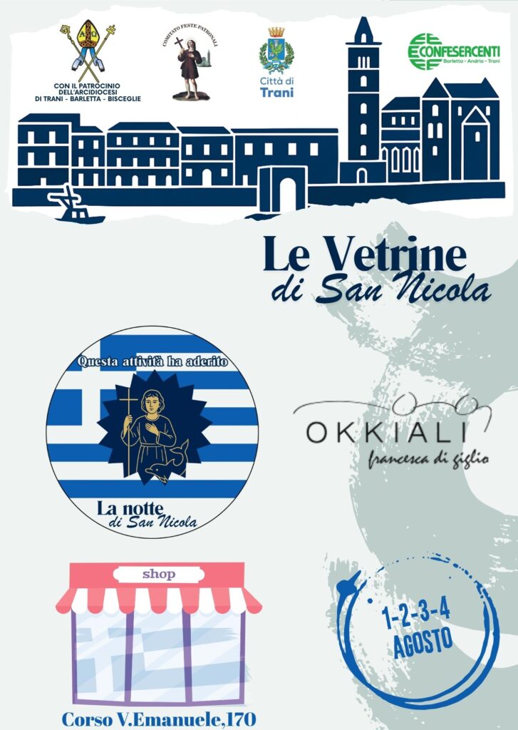 In occasione della festa del santo patrono, le vetrine di Trani si vestono di Bianco e Azzurro in onore alla Grecia, patria di San Nicola il Pellegrino.