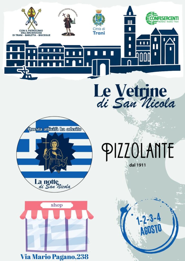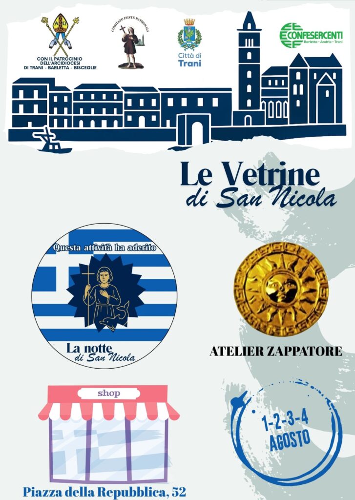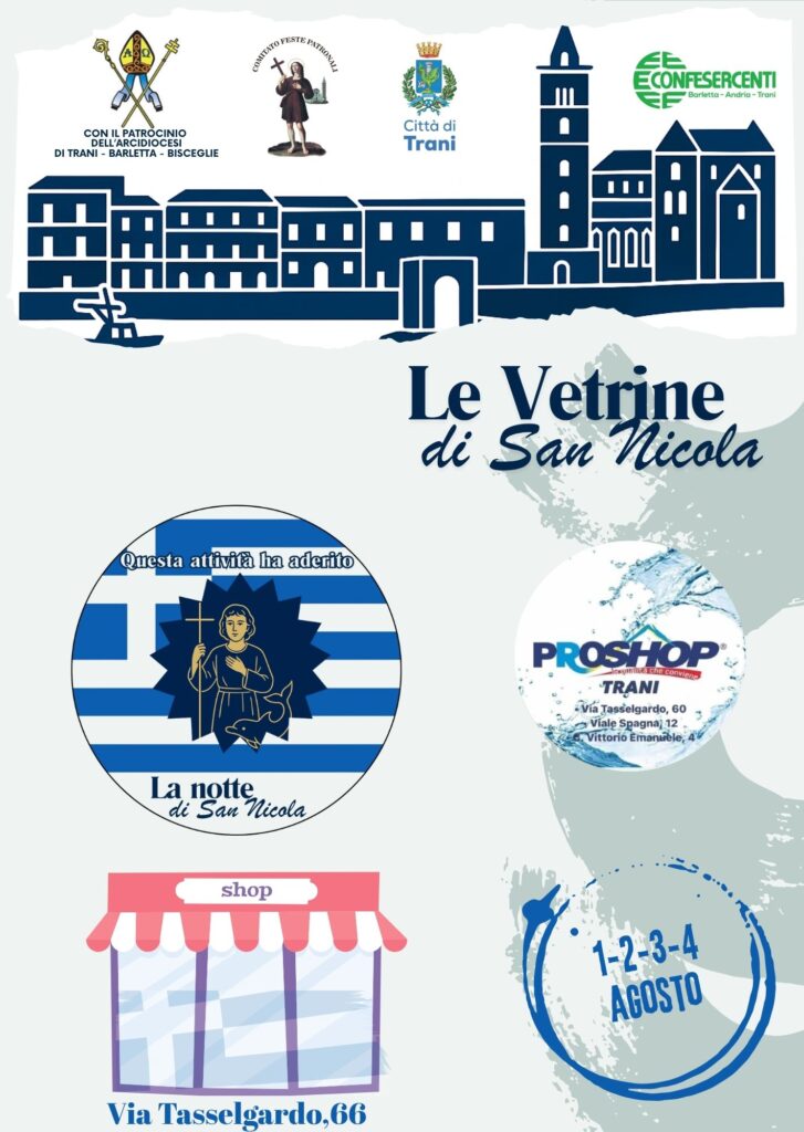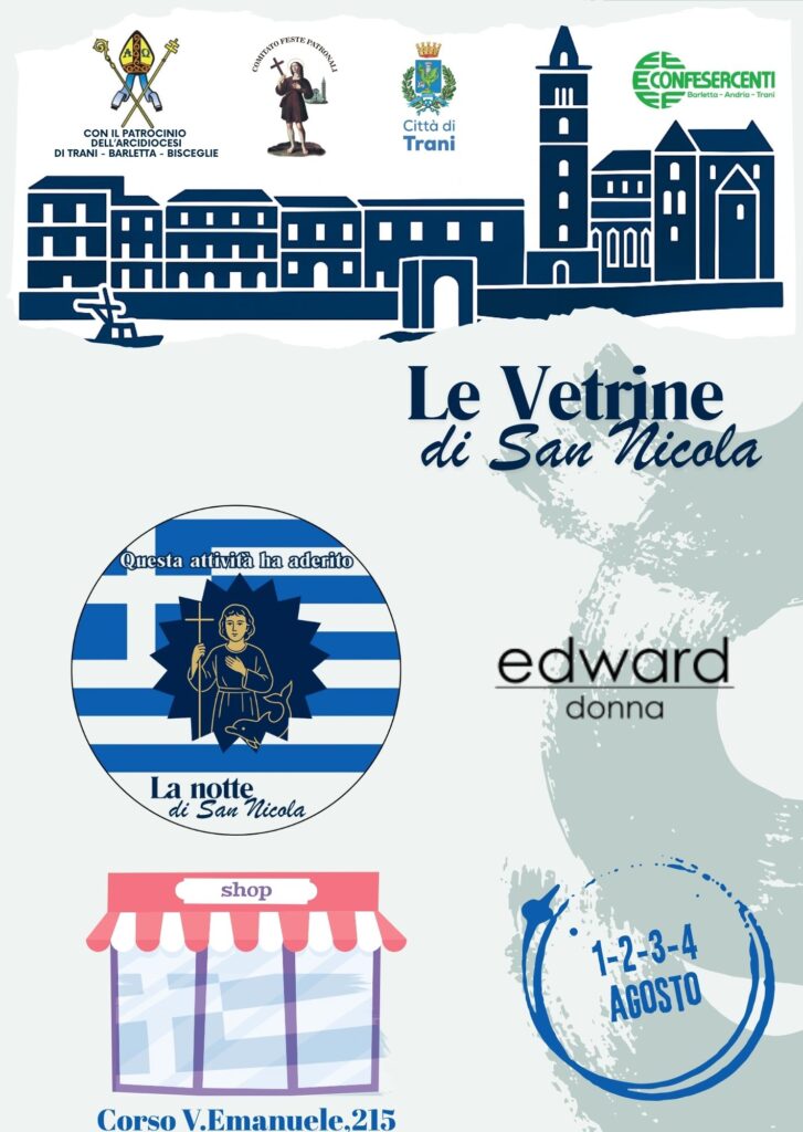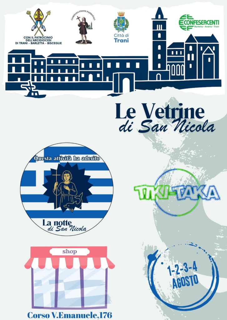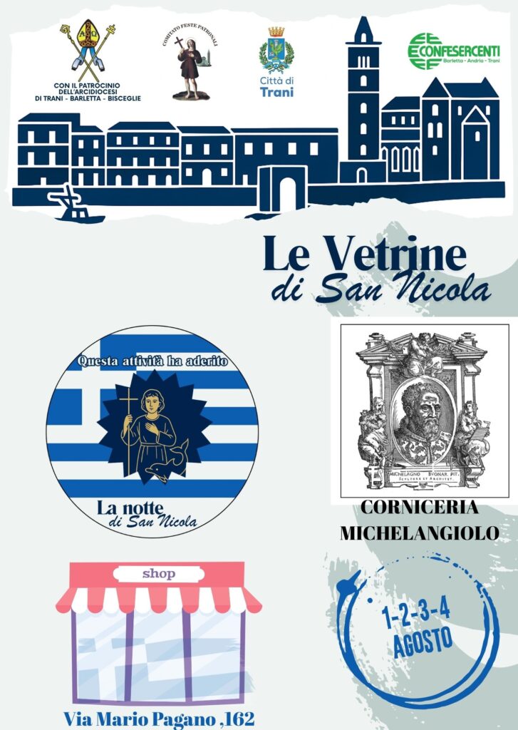 In occasione della festa del santo patrono, le vetrine di Trani si vestono di Bianco e Azzurro in onore alla Grecia, patria di San Nicola il Pellegrino.