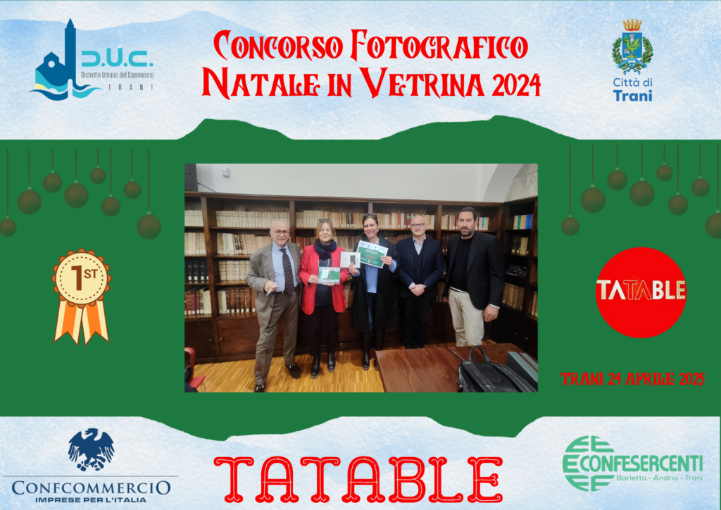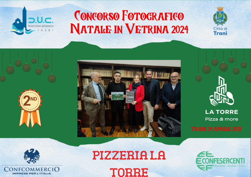 Il primo classificato è stato Tatable, che ha ricevuto un buono presso l’Hair Saloon Privè Trani. Al secondo posto si è piazzata Pizzeria La Torre, premiata con un buono presso le Palestre Timeout. Infine, il terzo classificato è stato Mondottica, che ha vinto una Bottiglia di Vino della Bottega Di Lernia.